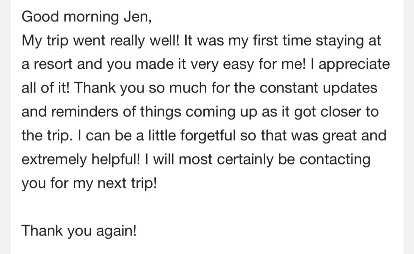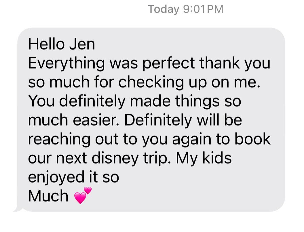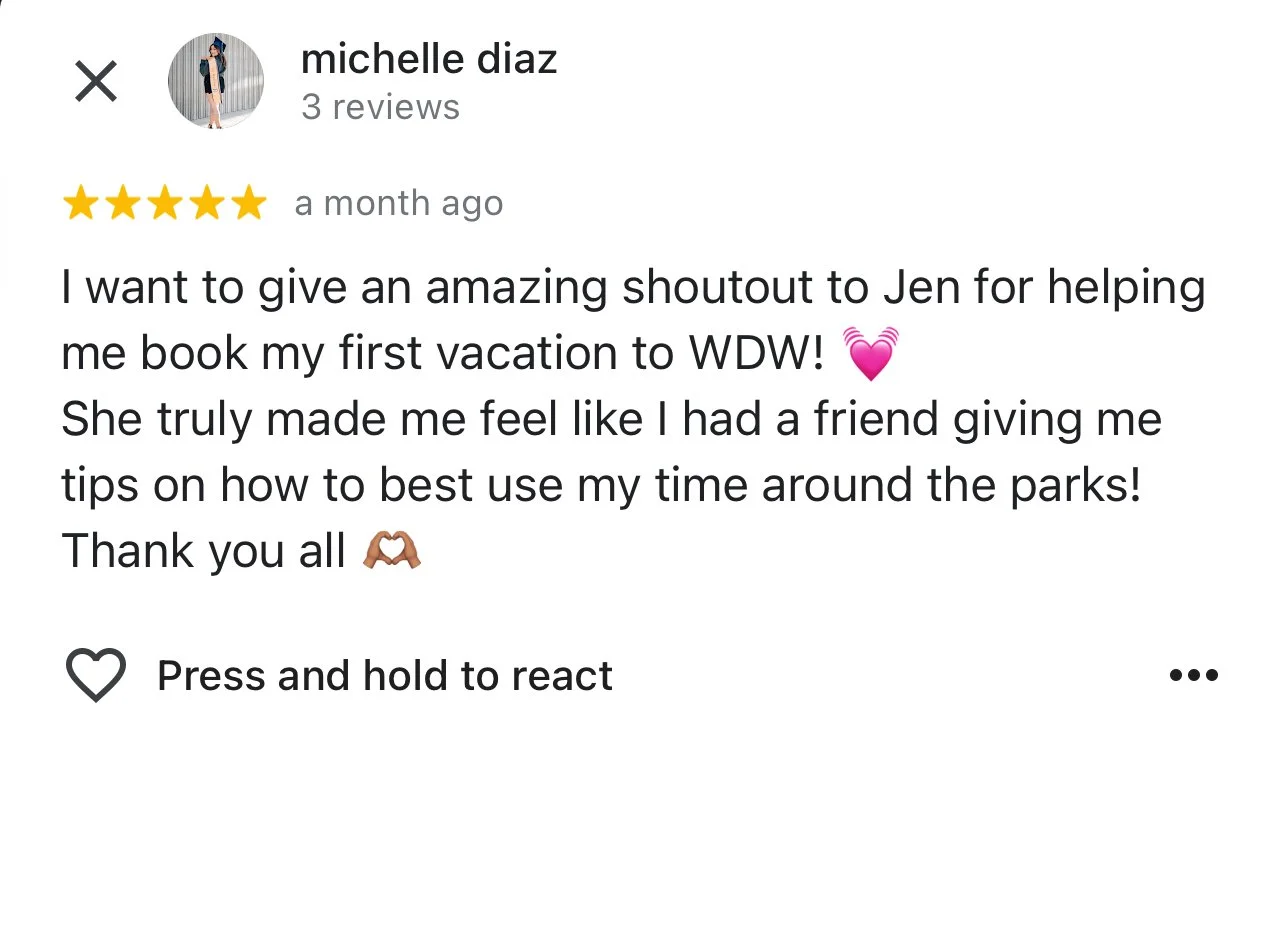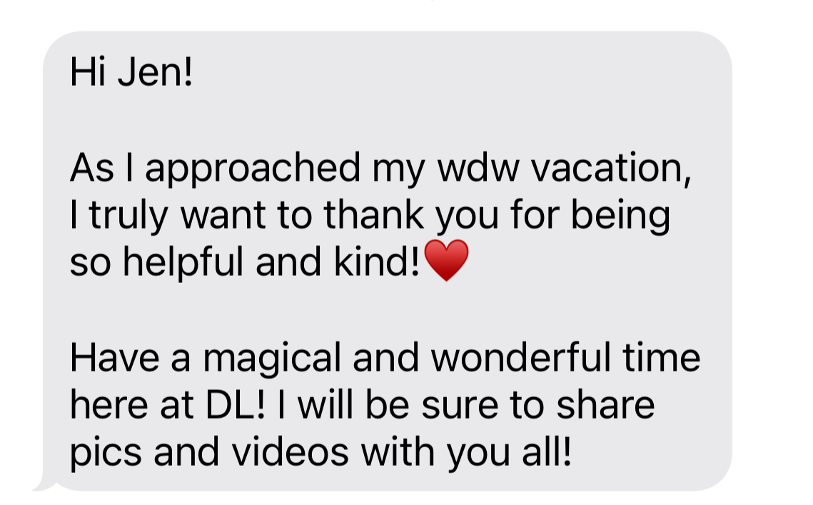 Thank you Jen for helping me plan the best first family vacation to Disney. From answering all of my questions, recommendations, and booking reservations Jen made going on this trip so easy to on. Will be reaching out to her again soon for our next trip