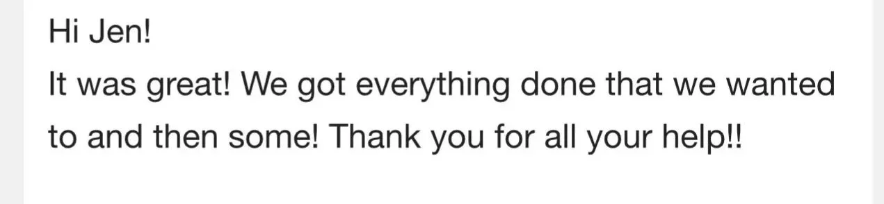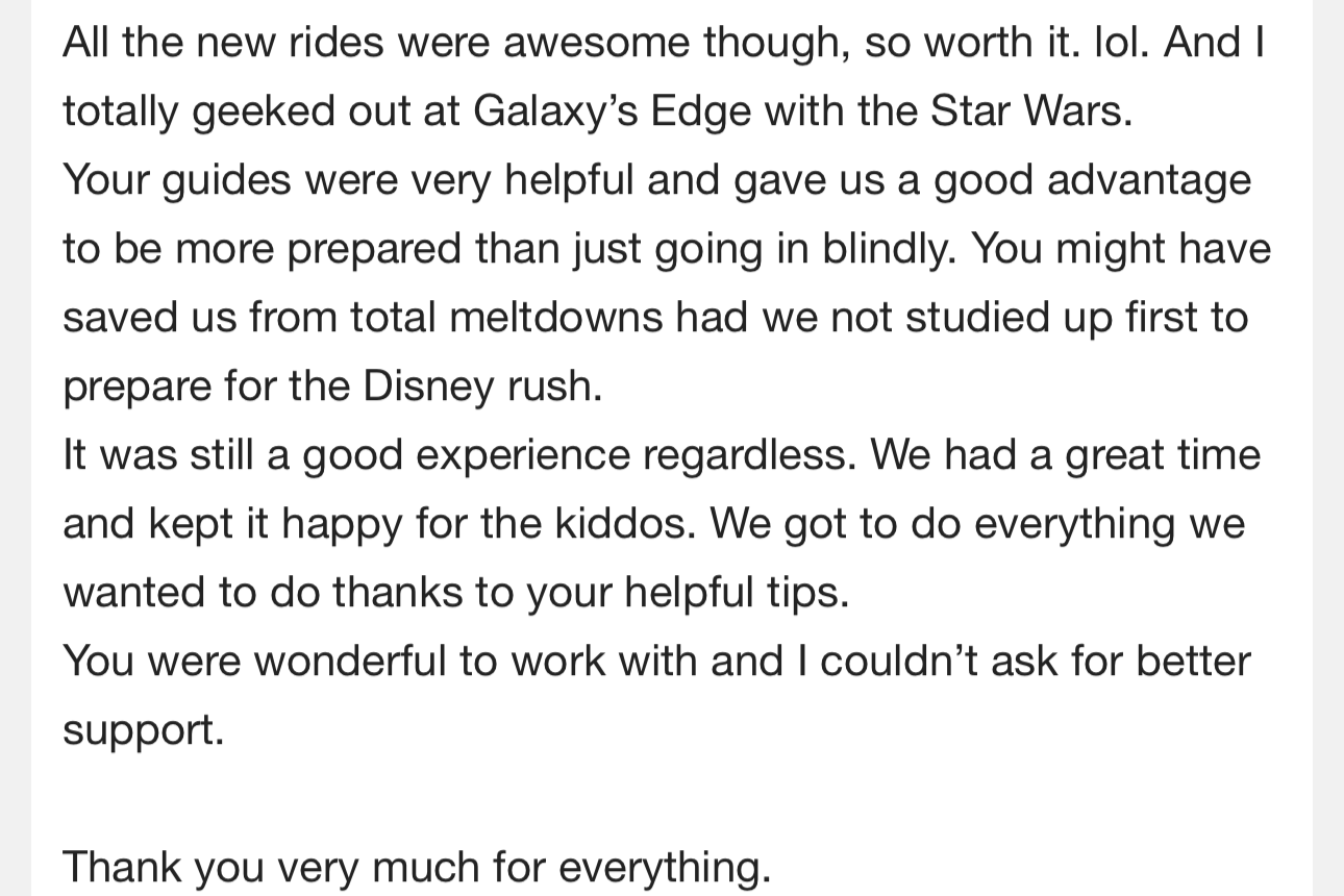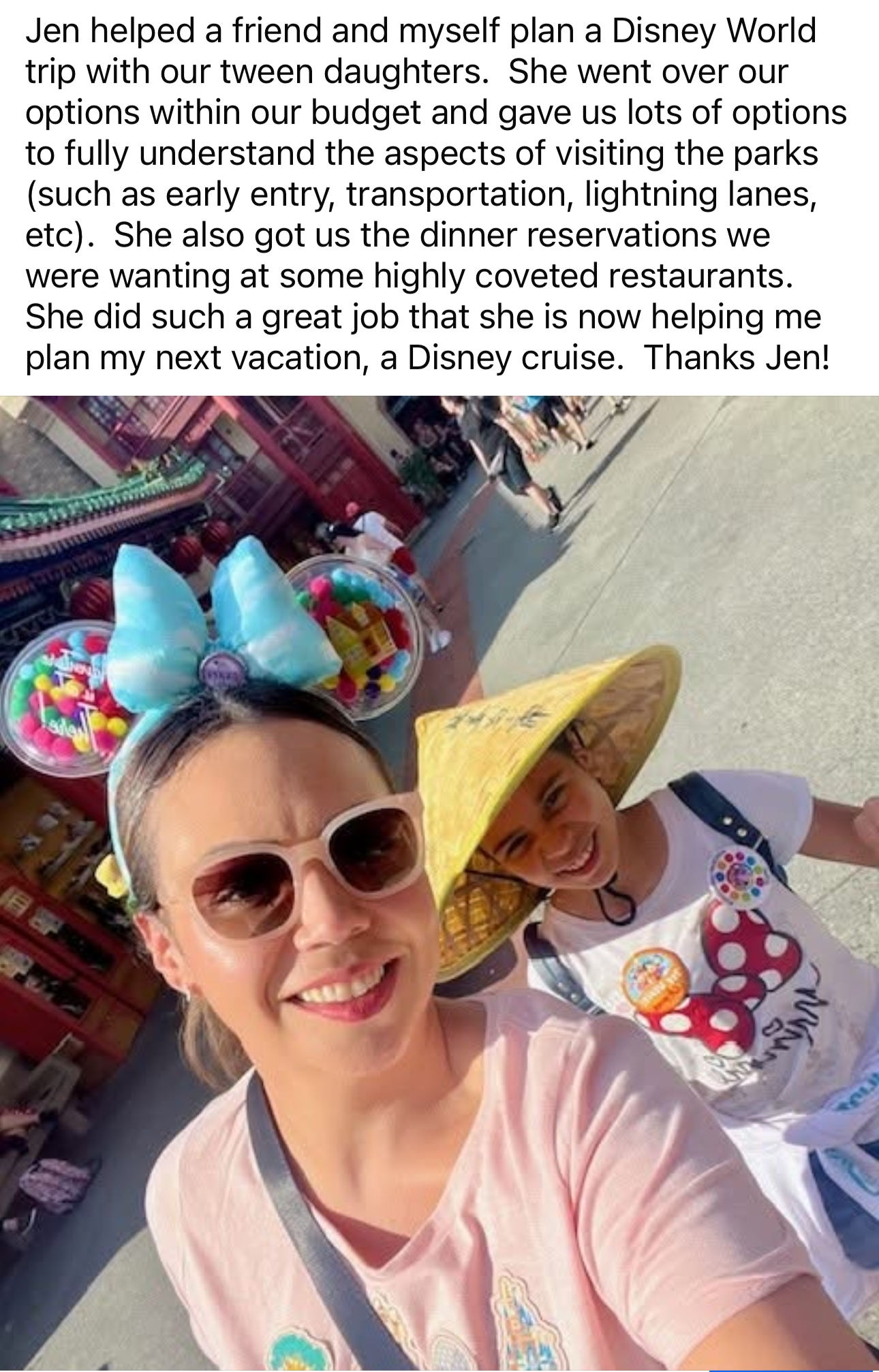 Jen was great for helping us plan our trip to Disneyland! Both of us were Disneyland newbies, who didn’t really know anything ahead of time, and she was soooooo patient with answering all the “silly” questions we had and helping us understand. I will absolutely be using her again, and recommend you do so, too!